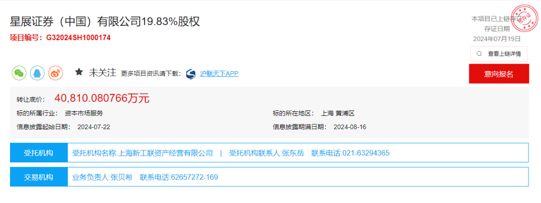 具体来看,上海东浩兰生投资管理有限公司拟转让所持星展证券20.17%的股权,转让底价为4.15亿元。上海黄浦投资控股(集团)有限公司、上海汇旸资产经营有限公司、上海黄浦引导资金股权投资有限公司拟共同转让所持星展证券19.83%的股权,转让底价为4.08亿元。